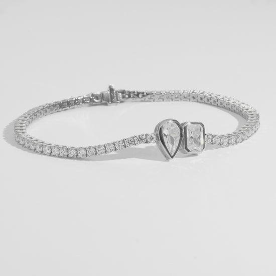 Complete your elegant and timeless look with our Serenity Tennis Bracelet. Featuring two stunning 1ct pear and emerald shaped stones, this luxurious gold bracelet will add a touch of sophistication to any outfit. Elevate your style to new heights with this exclusive piece.