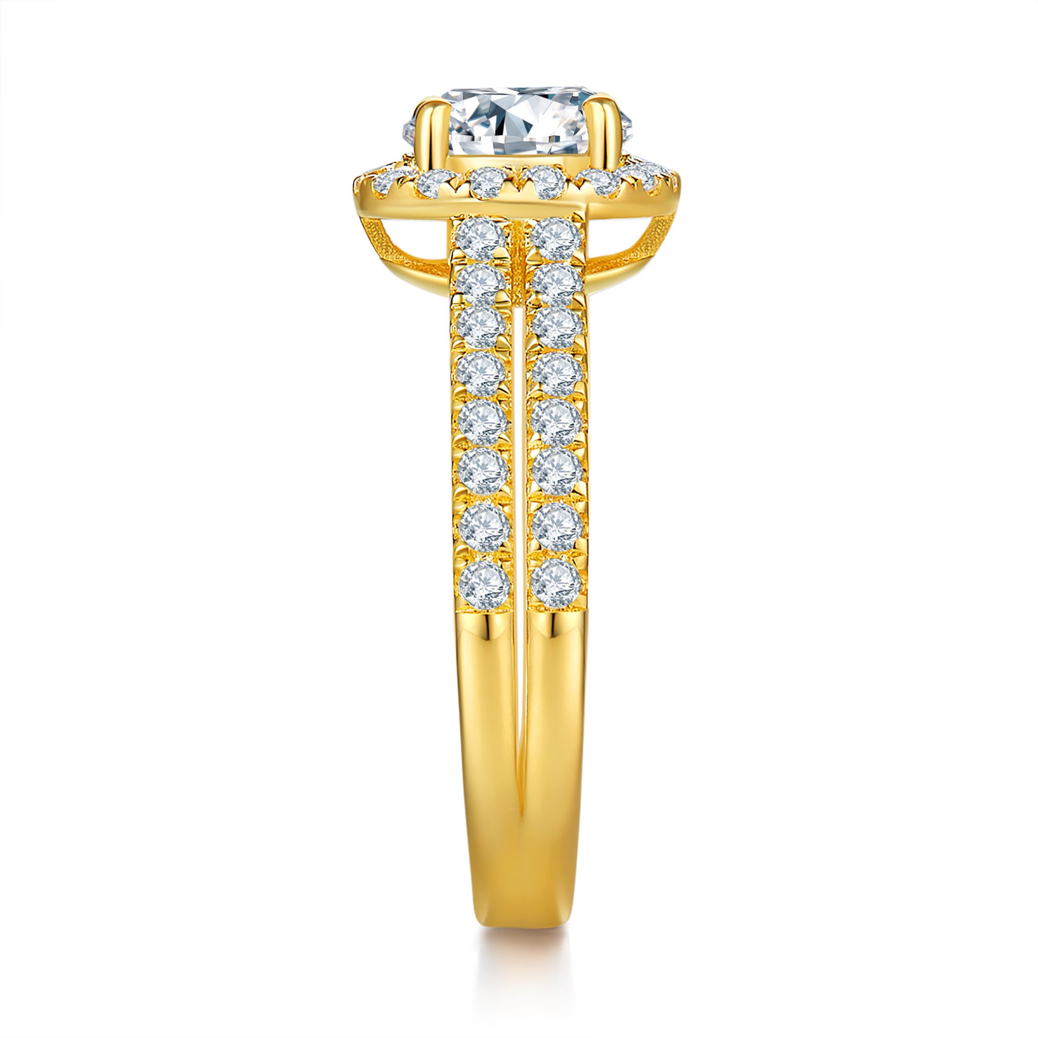 The refined split shank is lined with lab-grown pavé diamonds in F color and VS clarity, creating a sleek column of sparkle that elevates the ring from every angle.
