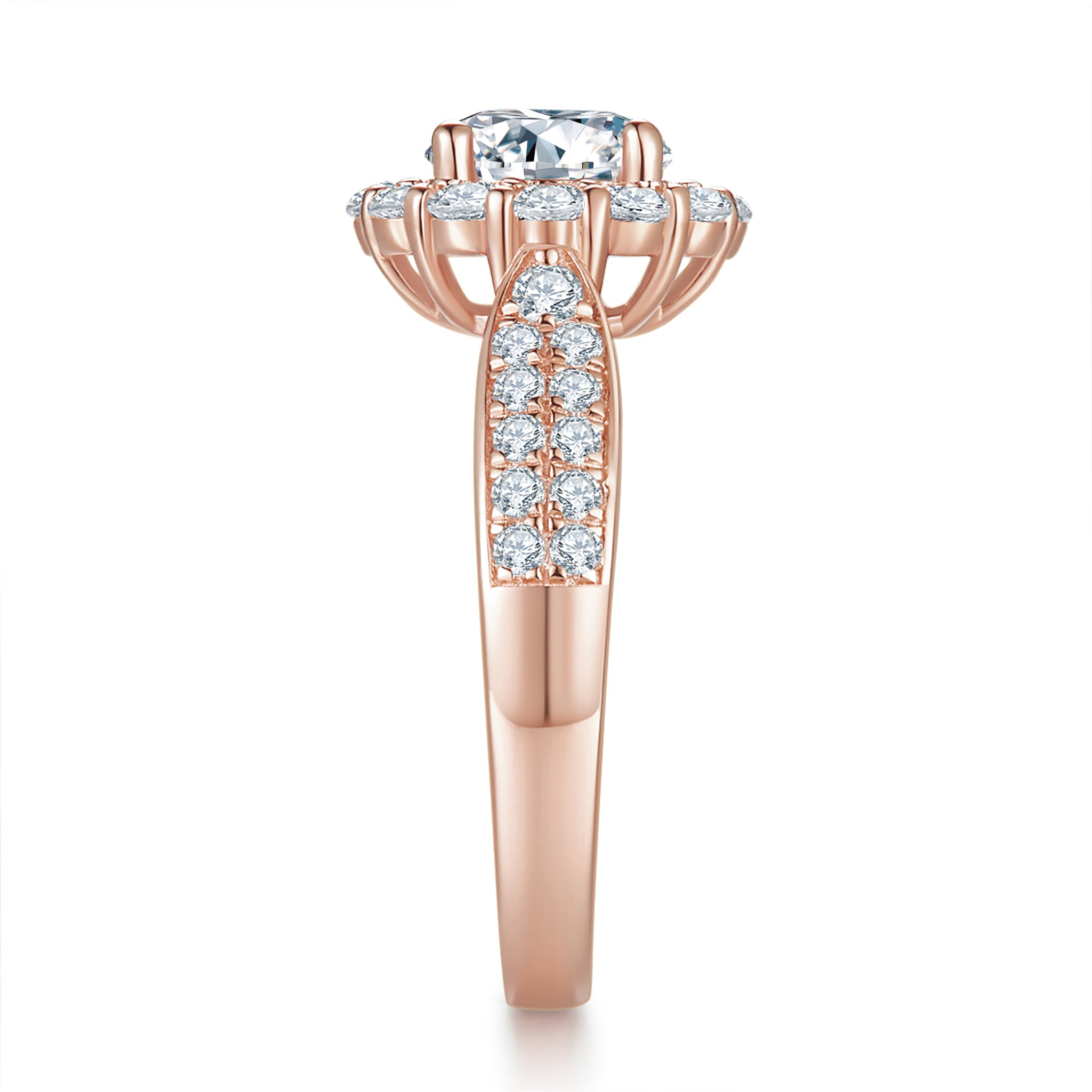 The pavé-set shoulders add extra sparkle, crafted with lab-grown diamonds in F color and VS clarity for a bright, luxurious finish.